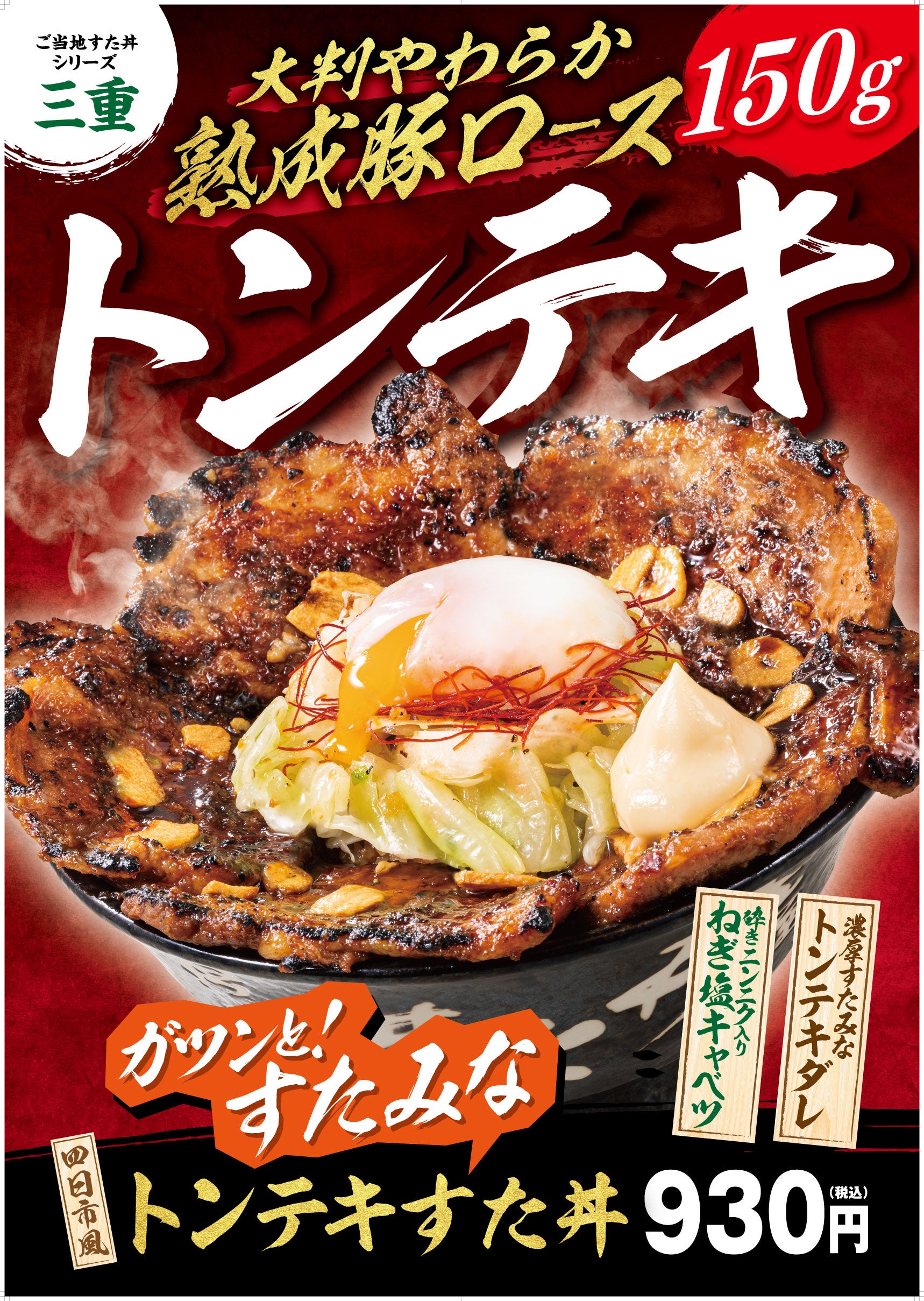 観光資源に恵まれている三重県は、じゃらんリサーチセンター調査による2022年度の都道府県魅力度ランキングでは総合3位となり、注目を集めています。そんな三重県のご当地グルメとして有名なのが、分厚い豚肉をニンニクと味の濃いタレでソテーした「四日市とんてき」です。味の濃いソース・ガッツリ利いたニンニクという「すた丼」との共通点も多く、ご当地すた丼4年ぶりの新作のテーマとして最適と考え、商品開発を決定いたしました。