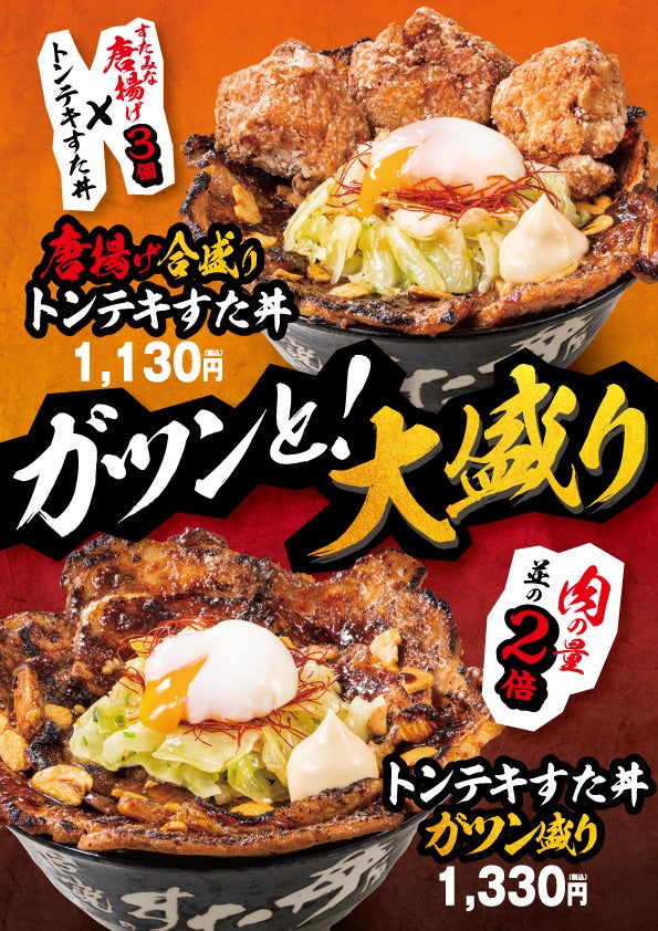 そんな幅広いニーズに応えるため、さらにボリュームを求める方に向けて『四日市風トンテキすた丼』では、並盛のボリュームはそのままに、”秘伝のニンニク醤油ダレ”をベースに生姜・酒と合わせた特製ダレにしっかりと漬け込み、ニンニクのパンチをガツンと効かせた当店自慢の『すたみな唐揚げ』3個を合盛りにした『唐揚げ合盛りトンテキすた丼』と、並盛の2倍の肉を溢れんばかりに盛り付けた『トンテキすた丼”ガツン盛り”』も発売いたします。特に『トンテキすた丼”ガツン盛り”』は総量約750g超のボリューム丼となっております。