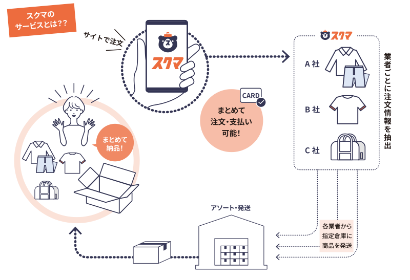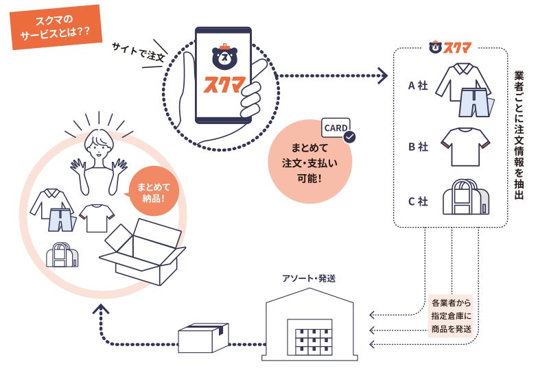 スクマは学用品販売のプラットフォームです。制服から学用品までの注文、納品を一括してひとつの窓口で手配できるため、学校、教員、各販売業者、保護者の方にかかる新入学時の作業負担を軽減いたします。