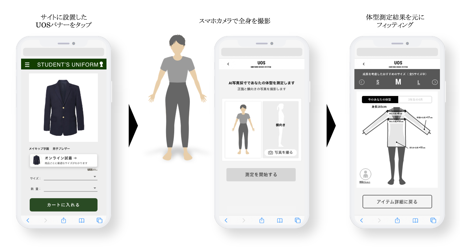 「UOS」はリモート採寸を可能にし、学生服メーカーや販売店が行う採寸・オーダー集計業務をサポートするシステムです。手持ちのスマートフォン端末で撮影した正面と側面の全身写真から、腕の長さや肩幅などの体型を測ることができるため、従来のように対面で測ってもらうことなく、リモートで自分に合うおすすめサイズを確認できます。また、洋服だけでなく、シューズやバッグといった服飾雑貨もフィッティングできます。