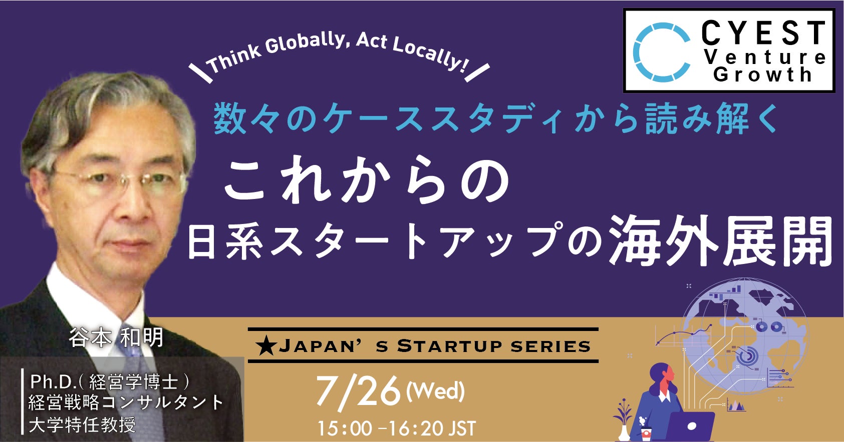 谷本教授は、スタートアップを既に起業したファウンダー、これから起業をしようと考えている方、または、日本のスタートアップに投資をしているベンチャー・キャピタリストのグローバルな観点の必要性に着目し、世界における日本の企業のポジショニング、なぜ国際競争で優れた実績を示していないかバックグラウンドを説明した上で、スタートアップの国際展開にどのように戦略を作成するか具体的なステップと具体的な事例をあげながら解説します。