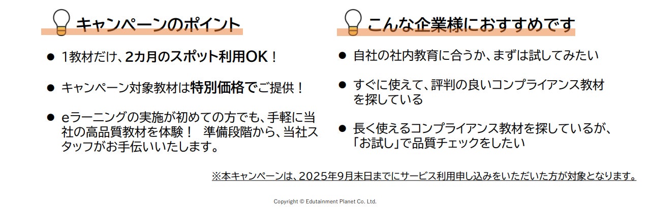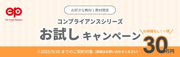 株式会社エデュテイメントプラネット(本社:東京都杉並区 代表取締役 柳田 善弘)は、2025年7月 、企業向けのコンプライアンスeラーニング教材をお得にご利用いただける「コンプライアンスシリーズ お試しキャンペーン」を実施します。