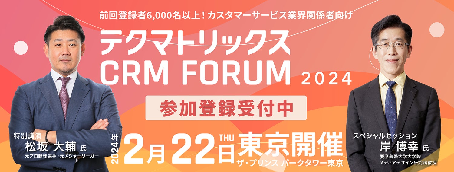 テクマトリックス株式会社 (本社:東京都港区、代表取締役社長:由利孝、以下「テクマトリックス」) は、コンタクトセンター/カスタマーサービスの業界動向や最新ソリューション、導入事例を紹介するコンタクトセンター/カスタマーサービス関係者向けイベント「テクマトリックスCRM FORUM 2024 ~CXと生成AI~」を、2024年2月22日(木)に東京(ザ・プリンスパーク東京)にて開催します。