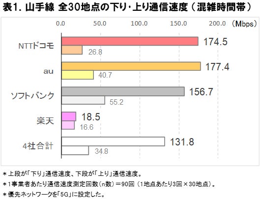 測定端末は、Google Pixel 7a。速度測定サイト「インターネット速度テスト」(Google)にて、1地点あたり下り(ダウンロード)と上り(アップロード)の速度を3回ずつ測定した。測定地点は、東京都内のJR山手線 全30駅のホーム。優先ネットワーク設定は「5G優先」に設定した。調査日は2025年6月16日~19日。平日の朝夕の混雑時間帯(7:00~9:00、17:00~20:00)に調査した。人の流れの障害にならない場所で測定するよう配慮した。