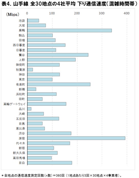 今回調査における下り通信速度の最速地点は原宿駅ホームであり、4社平均下り速度は393.2Mbpsであった。原宿駅と巣鴨駅(339.0Mbps)の2駅が、4社平均で300Mbpsを超えた。一方で、4社平均の下り速度が最も遅かったのは、品川駅であり、14.8Mbpsに留まった。