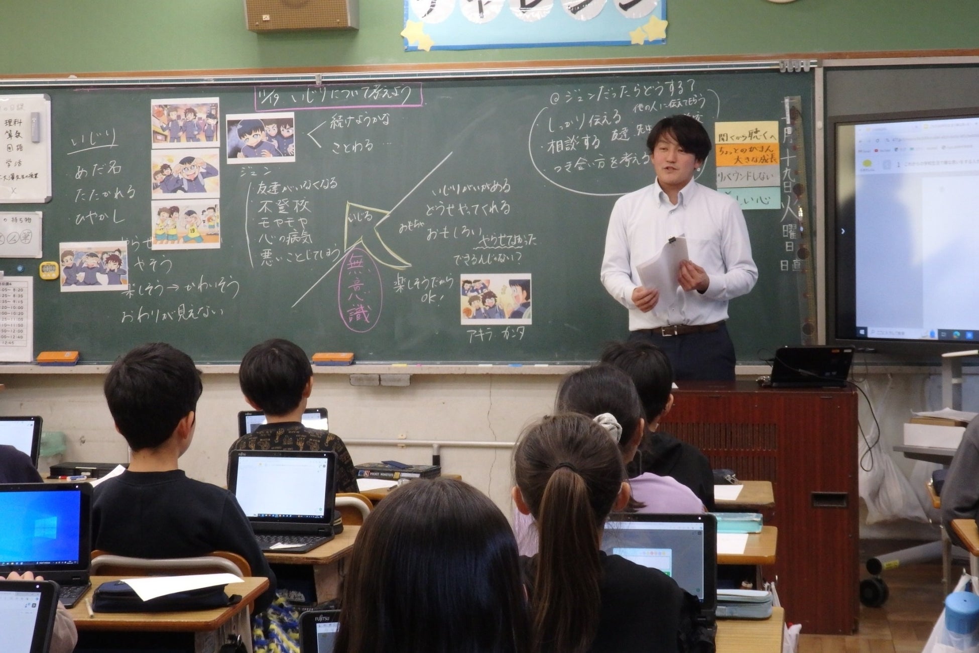「SOSの出し方に関する教育」の一環として、授業を行いました。この授業では、事前に保護者からのアンケートを実施し、「もしこのようなことが自分の子供に起こり、相談されたらどんな言葉をかけてあげたいですか?」という質問に回答してもらいました。授業では、登場人物の心情を丁寧に扱い、考え方は人それぞれ違うということを理解しながら、自分自身が苦しい状況をどのように変えることができるかについて考えました。授業の終盤では、保護者からのアンケートの一部を紹介し、相談することで解決の糸口を見つけることができることを児童たちに気づかせました。