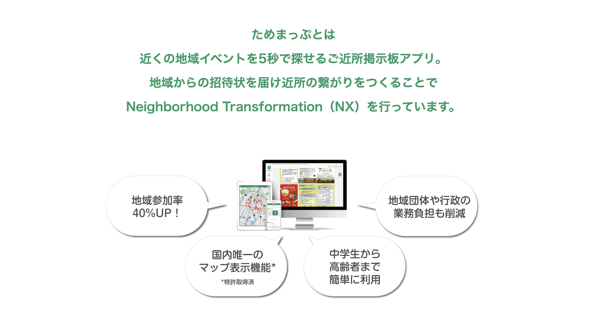 地域参加情報掲示板Webアプリ「ためまっぷ(*特許取得済)」を、自治体や中間支援組織等と開発・普及定着を協働するBtoGビジネス。 *イベント情報の距離制限表示機能の特許(特許第6293100号)