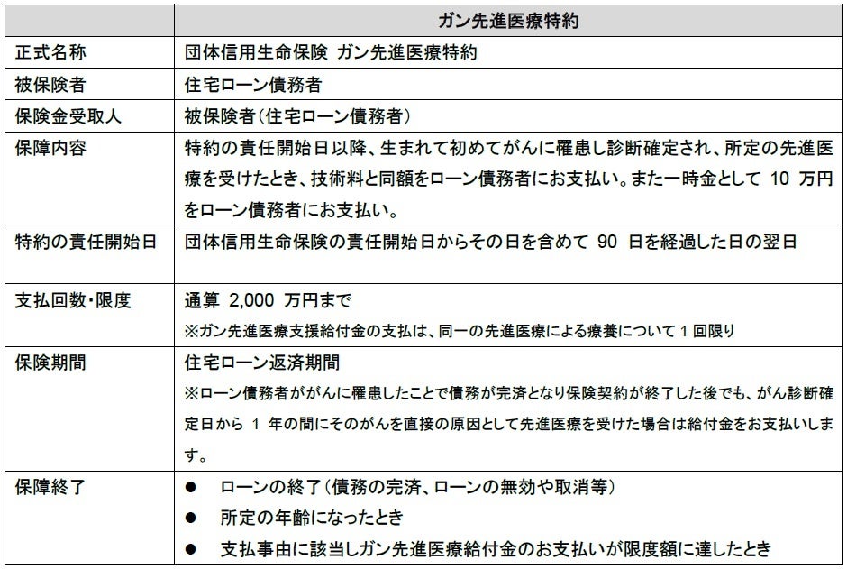 ローン債務者が所定のがん先進医療を受けたときにお支払いする「ガン先進医療給付金」の1回の療養あたりのお支払い金額の上限(500万円)を拡大し、また同給付金の通算金額の上限を、従来の1,000万円から2,000万円に引き上げました。