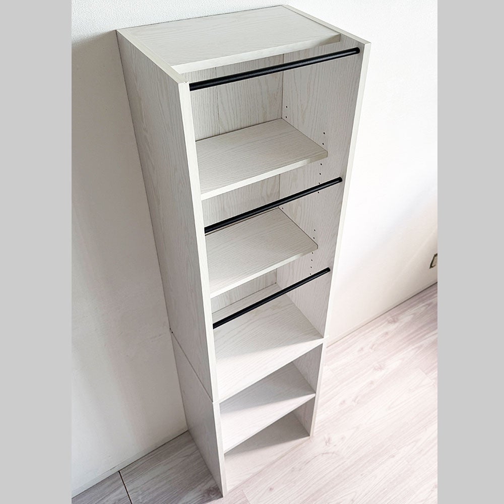 「縦長1台完結型」の設計により、ハンガーポールと棚がスリムに一体化。