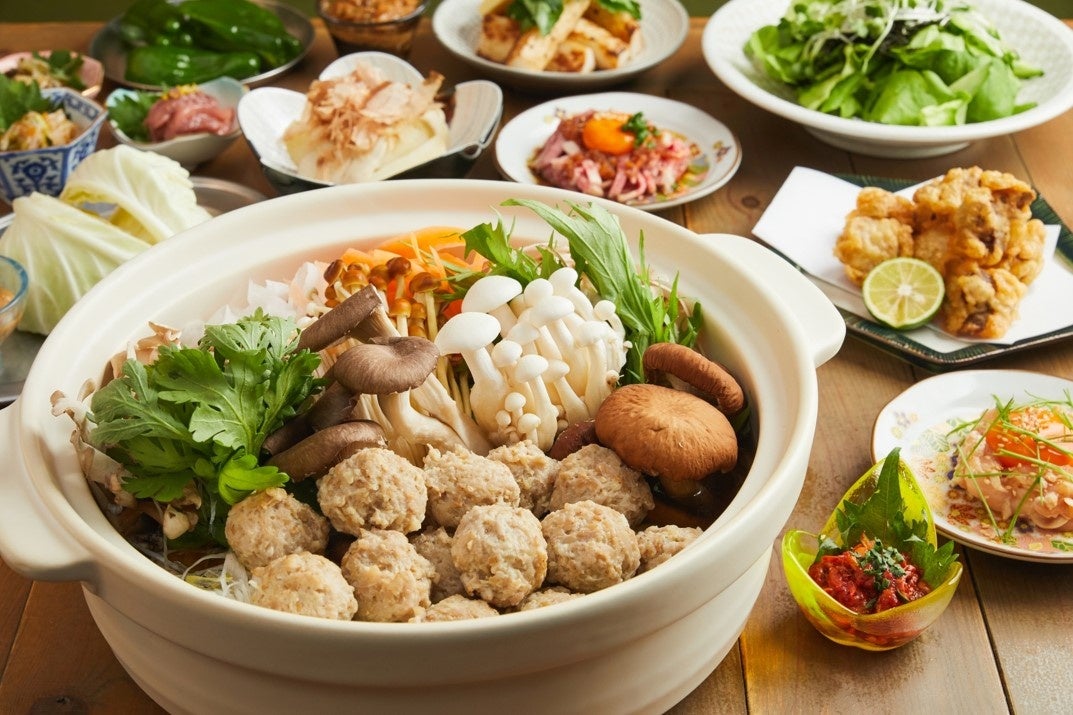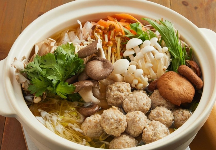 旬の野菜と自家製鶏つくねの鍋。かつお出汁の効いたスープと山椒ペーストがお楽しみいただけます。追加429円から雑炊やラーメンも楽しめます。