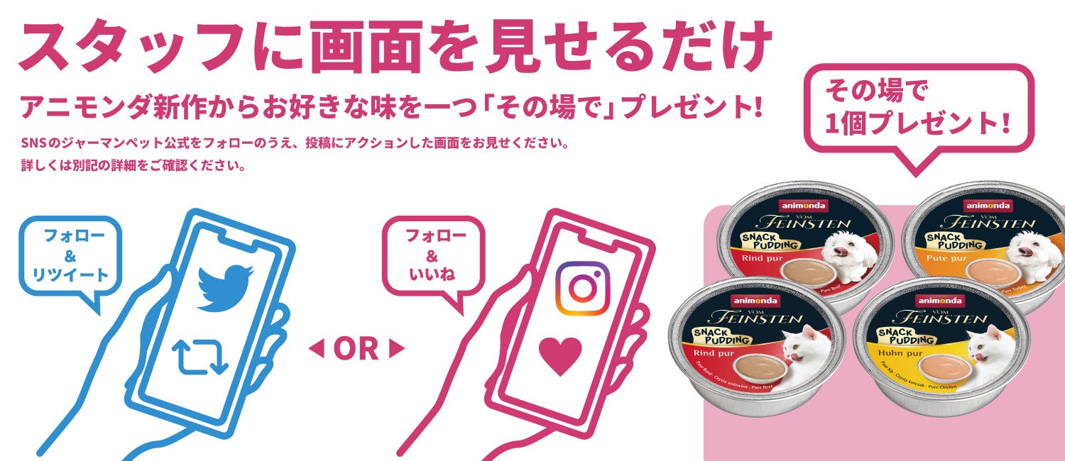 また、インターペット一般来場者限定のその場でもらえるプレゼントキャンペーンを開催いたします。期間中、アニモンダブースにて、ジャーマンペットの「instagram」または「twitter」アカウントをフォローのうえ、対象の画面をスタッフに見せるだけで、その場で好きなお味の「フォムファインステン スナックプディング(試供品・85g入り)」を1個プレゼントいたします。(お1人様1回まで・無くなり次第終了)その場でフォローしていただいた方にもプレゼントいたしますので、お立ち寄りの際にはお気軽にスタッフへお声がけください。