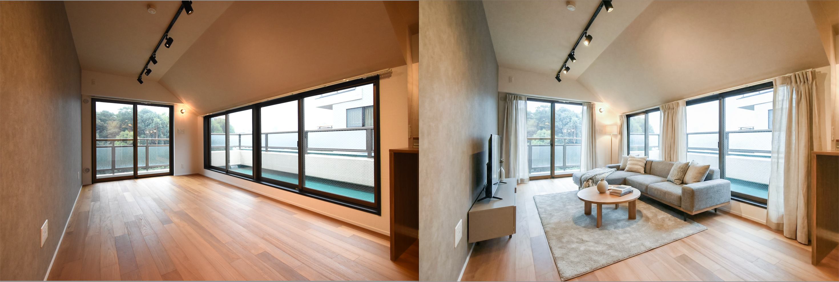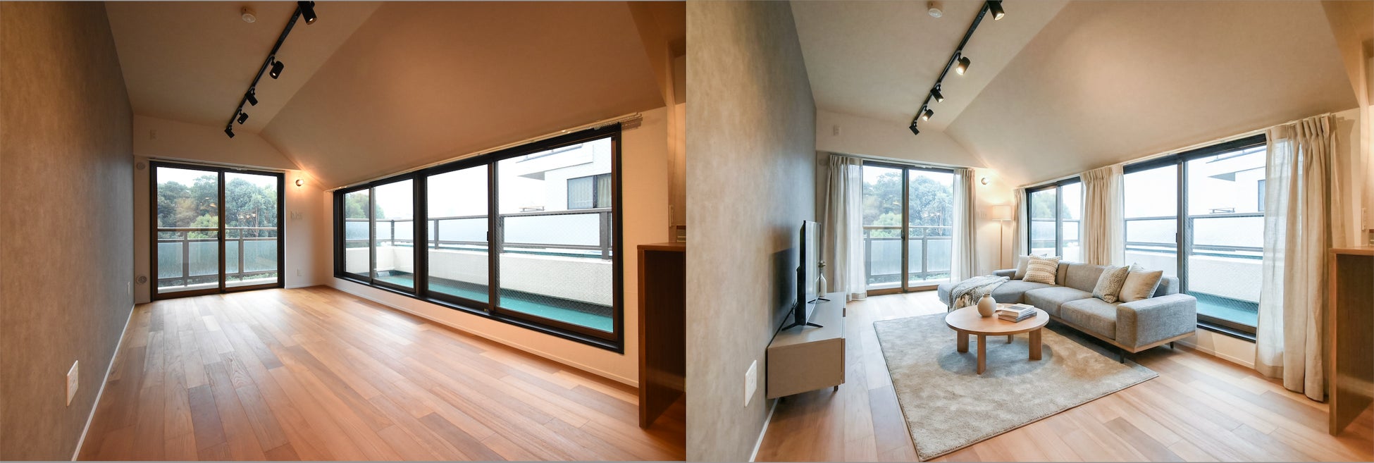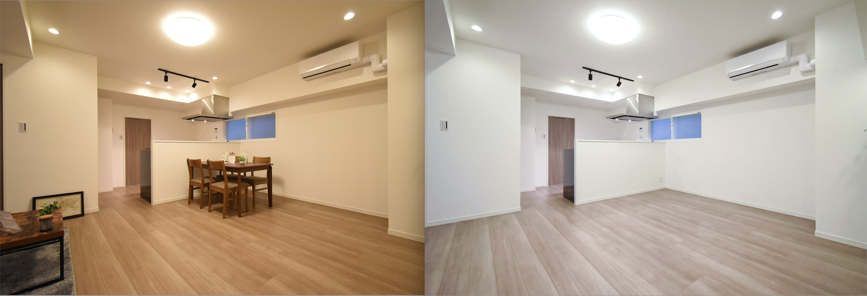 不動産広告では、「空室では暮らしのイメージが伝わらない」「居住中の写真は生活感が強く掲載しづらい」といったお声が多く存在します。AI-propのAIバーチャルホームステージングでは、空室写真に対して自然な家具・インテリアを自動配置し、購入・入居後の生活を直感的にイメージできる写真へと加工します。 また、不要物の除去機能では、写真内の家具・家電・小物などをAIが自動認識し、違和感のない空室写真へと加工することが可能です。