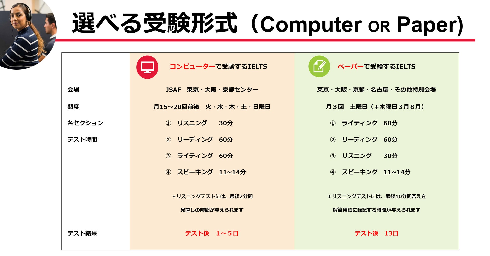 ※IELTSペーパー版(テスト結果13日後)、IELTSコンピューター版(テスト結果1~5日以内)