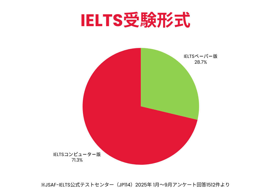 ペーパー試験は紙ベースで本番を想定した準備がしやすく多くの受験生、特に学生層に人気の受験形式ですが、2019年より開始したIELTSコンピューター版をきっかけに、「早く結果を知りたい」「タイピングでライティングしやすい」といった理由でIELTSコンピューター版の受験者が急増しました。さらに、コンピューター版の場合は、最短翌日結果開示や1技能のみ再受験できるIELTS One Skill Retakeなどの利点があり、今ではコンピューター版を選択する受験生の方が多くなりました。