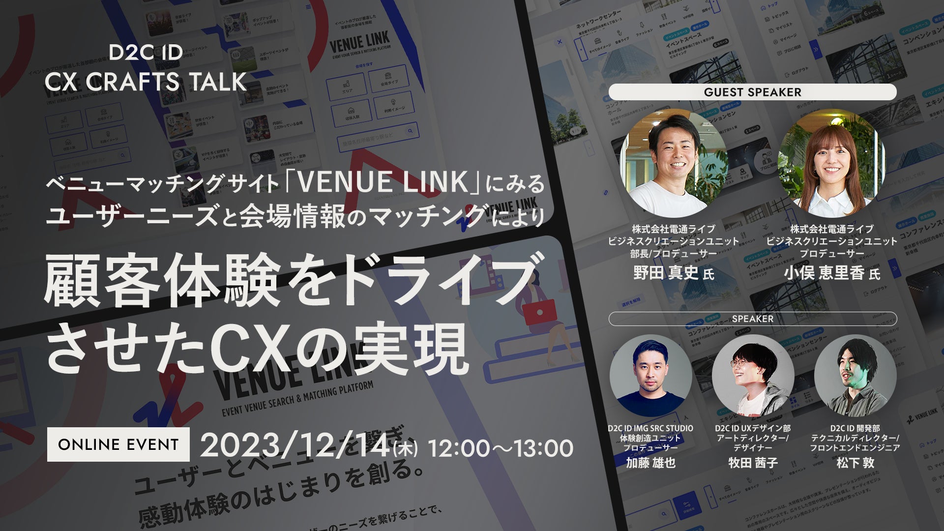 株式会社D2C ID(本社:東京都港区、代表取締役社長:岡 勇基、以下D2C ID)は、2023年12月14日(木)に無料ウェビナー『D2C ID CX CRAFTS TALK:ベニューマッチングサイト「VENUE LINK」にみる ユーザーニーズと会場情報のマッチングにより顧客体験をドライブさせたCXの実現』を開催します。