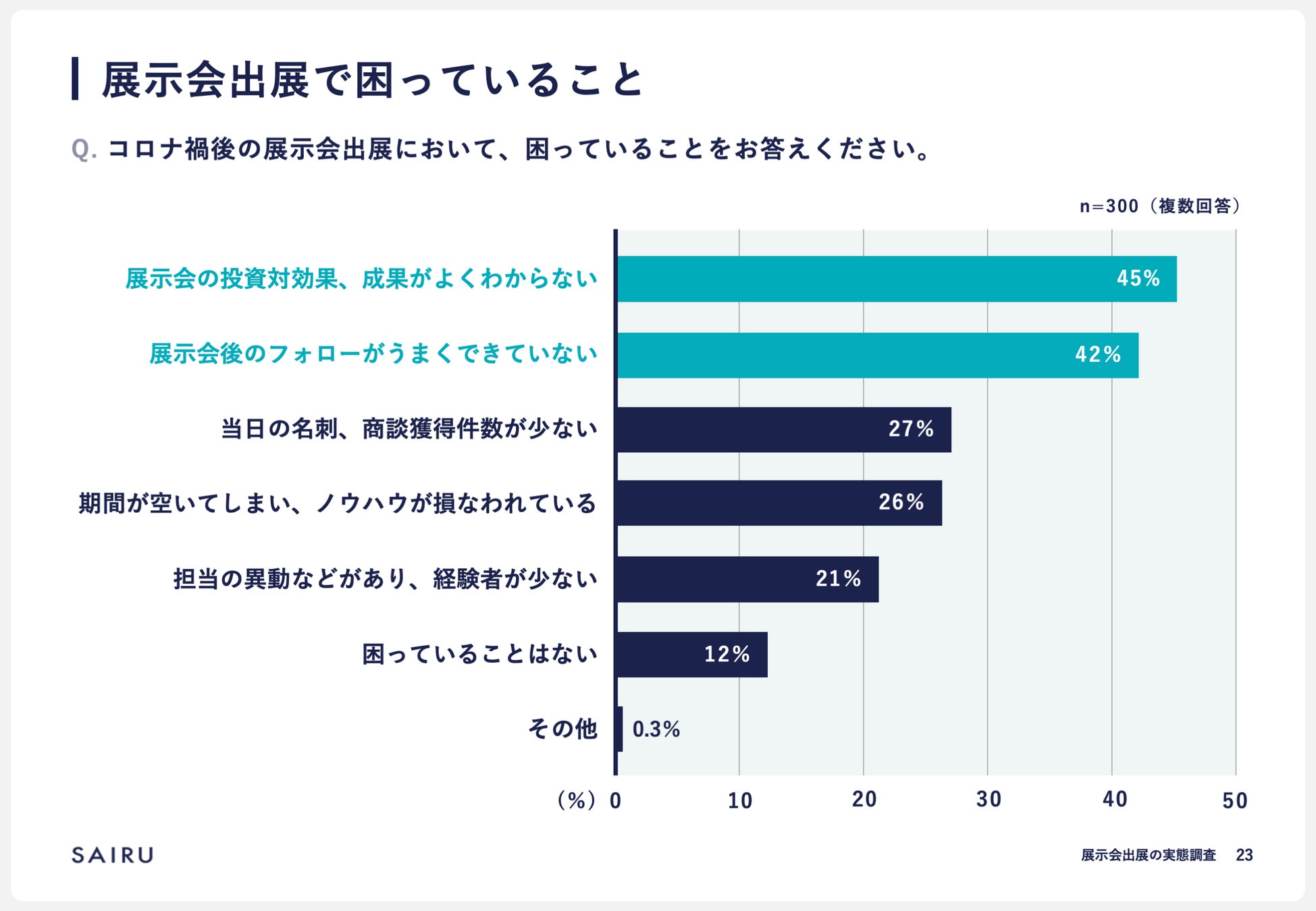展示会出展における課題――約9割の企業が投資対効果の算出やフォローアップで苦慮
