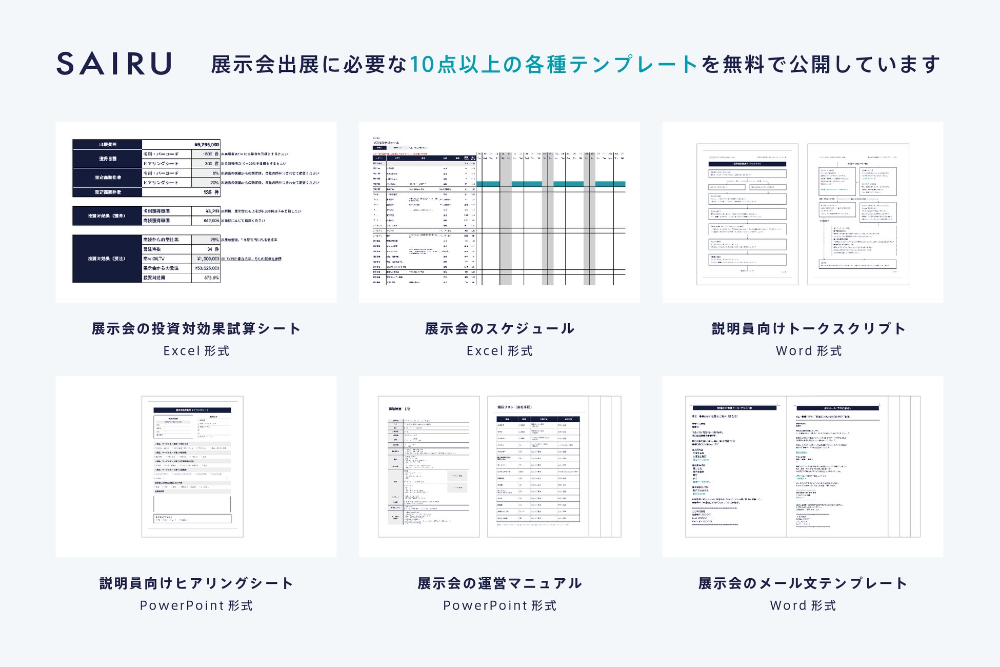 また投資対効果を試算するためのテンプレート、来場者へのヒアリングで使用するトークスクリプト、フォロー時に役立つコールスクリプトやアポイント打診用のメールテンプレートなどの必要なテンプレートもガイドブックに付録しており、まとめてダウンロードできます。