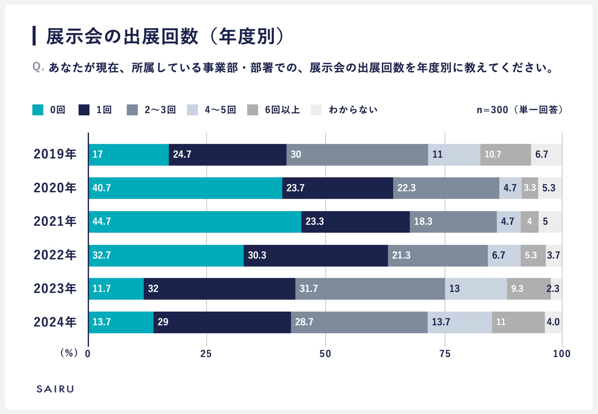 2019年から2024年の展示会の出展回数について年度別に聞いたところ、2020年、2021年は減少、2023年以降は回復傾向にありました。