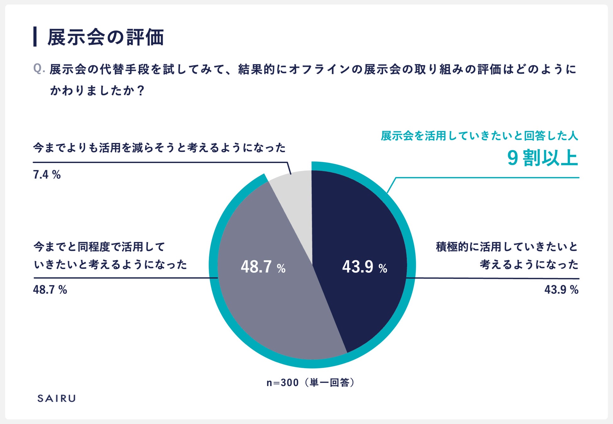 「展示会の代替手段を試してみて、結果的にオフラインの展示会の取り組みの評価はどのようにかわりましたか?」という質問に対して、「今までと同程度で活用していきたいと考えるようになった」(48.7%)、「積極的に活用していきたいと考えるようになった」(43.9%)と、オフライン展示会の出展に意欲を示す回答が9割以上を占めました。