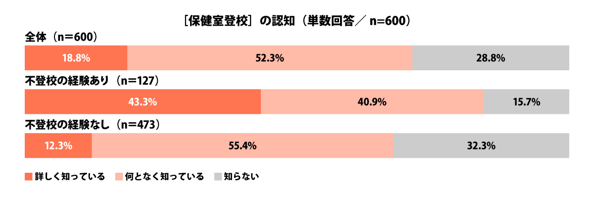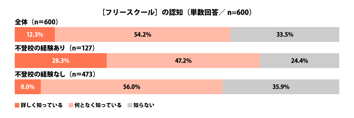 [保健室登校][フリースクール][通信制高校]の認知は半数以上だが、[サポート校]に関しては3割程度。