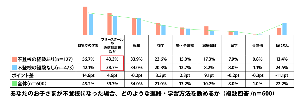 もしお子さまが不登校になった場合、どのような進路・学習方法を勧めるかを聞くと、「自宅での学習」が最も多く45.2%となりました。次いで「フリースクールや通信制高校など」と続く結果となっています。「フリースクールや通信制高校など」は不登校の経験の有無にかかわらず高い結果となっており、全日制の学校に通う以外の選択肢を持ちやすくなっているのではないでしょうか。