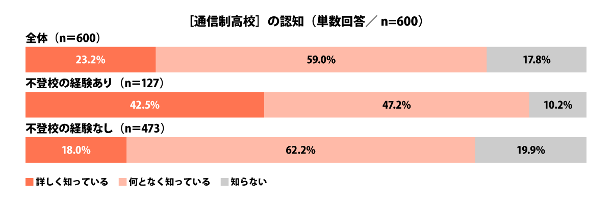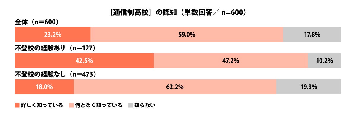 一方で、通信制高校に通う生徒の学習面や生活面をケアするサポート校はまだあまり知られておらず、不登校経験者の認知も半数程度です。「学校には行きたいけど、教室に入れない」という生徒のための保健室登校、家と学校以外の第三の場所を提供して復学や自立を促すフリースクールの認知度も十分に高いとは言えず、これからも認知拡大に向けた働きかけが必要です。