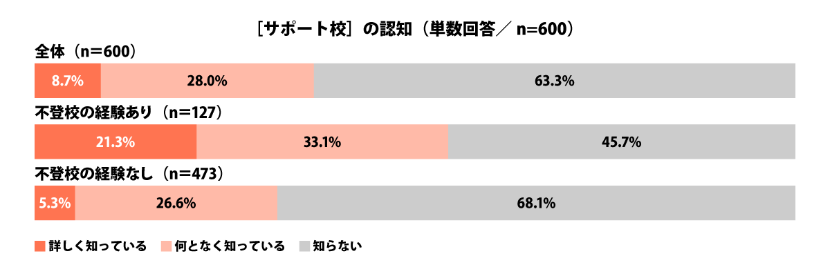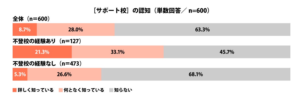 各項目の認知をお聞きすると、どの項目も不登校経験者の認知が高い結果となりました。しかし、[サポート校]に関しては「詳しく知っている」「何となく知っている」と回答した方が36.7%、不登校経験者でも54.3%とあまり高くない結果となりました。