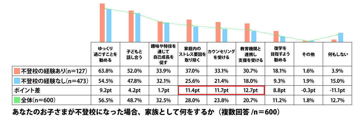 もし自分の子どもが不登校となり、学校を休むことになった場合、家族として何をするかを聞くと、「ゆっくり過ごすことを勧める」が最も多い。「家庭内のストレス要因を取り除く」「カウンセリングを受ける」「教育機関と連携し支援を受ける」に関しては、不登校経験者が10ポイント以上多く回答。