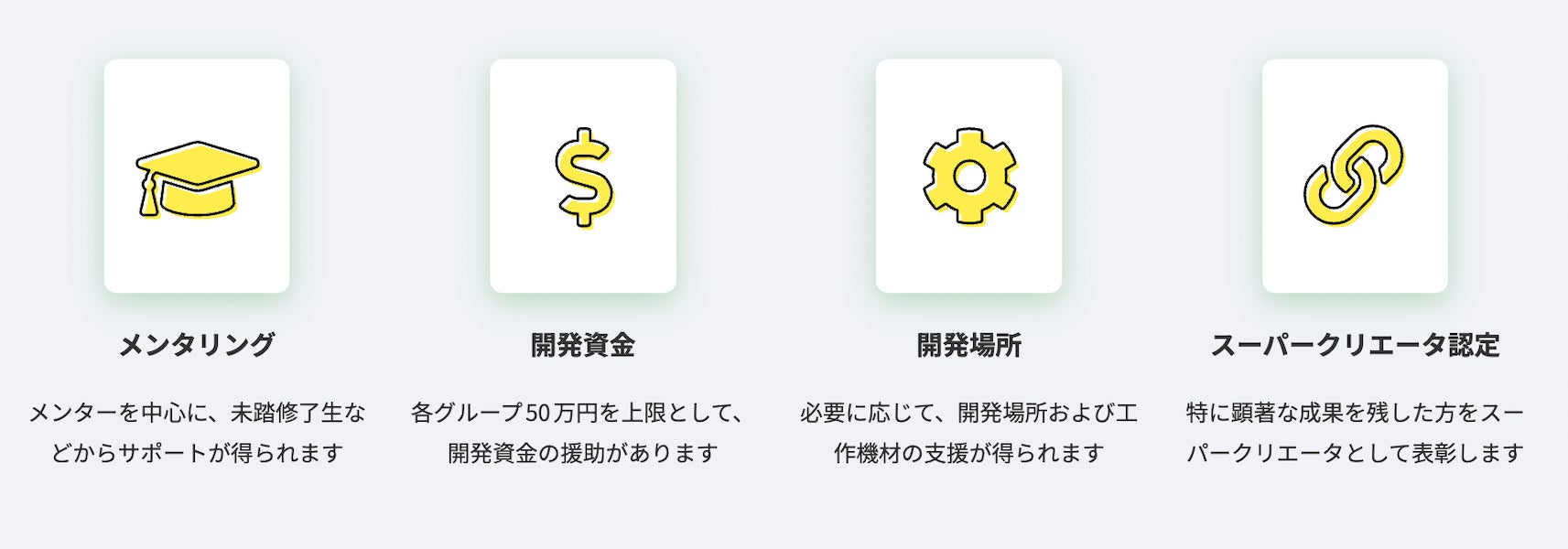 未踏ジュニアは、採択されたクリエータに対し、メンターや専門家による指導、また最大50万円の開発資金や開発場所・機材を提供し、ソフトウェア・ハードウェアの開発を約5か月間にわたって支援するプログラムです。参加は無料で、採択後のプログラムに関する費用(発表会場への交通費、宿泊費など)は未踏ジュニアが負担します。