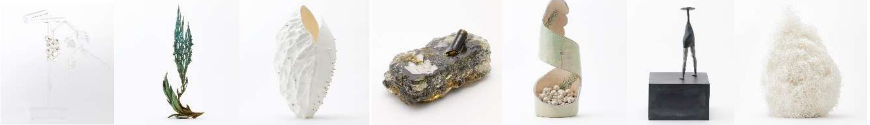 (左より)「Hide and Seed」ta_rabo 氏、「蒼の記憶」河野太郎氏、「冬芽」小堺勝氏、「Soil of Memories」VIKI 氏、「包(つつむ)」小林ミク氏、「層雲 pt.2」竹内康雄氏、「はじける」 植松美月氏