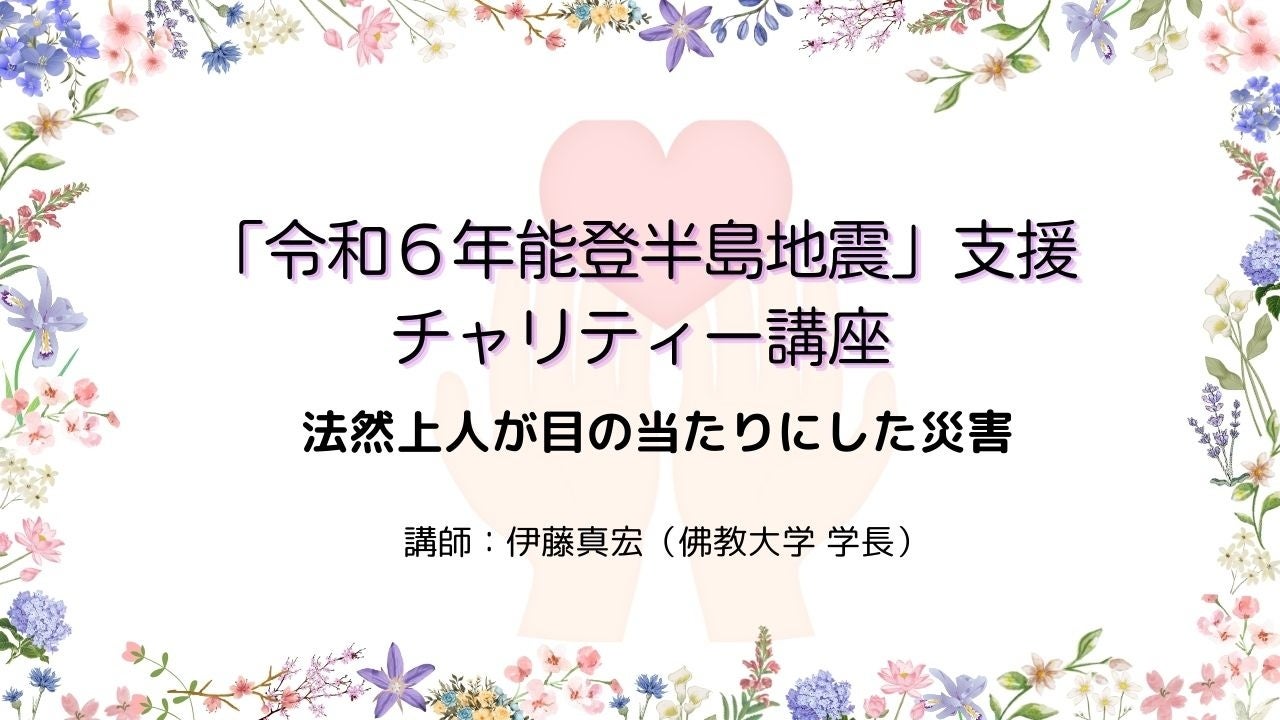 令和6年1月1日に発生した能登半島地震の復興には時間を要し、今もなお困難な状況の方がたくさんおられます。佛教大学オープンラーニングセンターでは、下記の通り昨年度2月に引き続き2回目となるチャリティー講座を実施し、被災地の状況を忘れないように、そして少しでも被災された方々のお役に立てればと考えています。