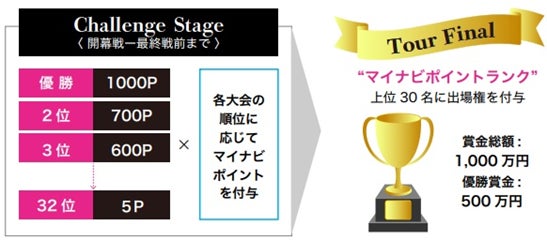 各試合の順位に応じて“マイナビポイント”を付与します。ポイント上位者は次回ツアーの優先出場権を得るほか、ポイントランキング上位30名はツアーファイナル出場権を手にすることができます。(他、該当する条件を満たした選手)
