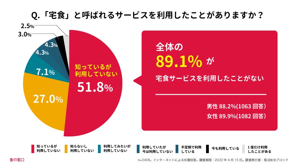 宅食サービスを利用したことがないという人が、アンケート全体の89.1%でした。
