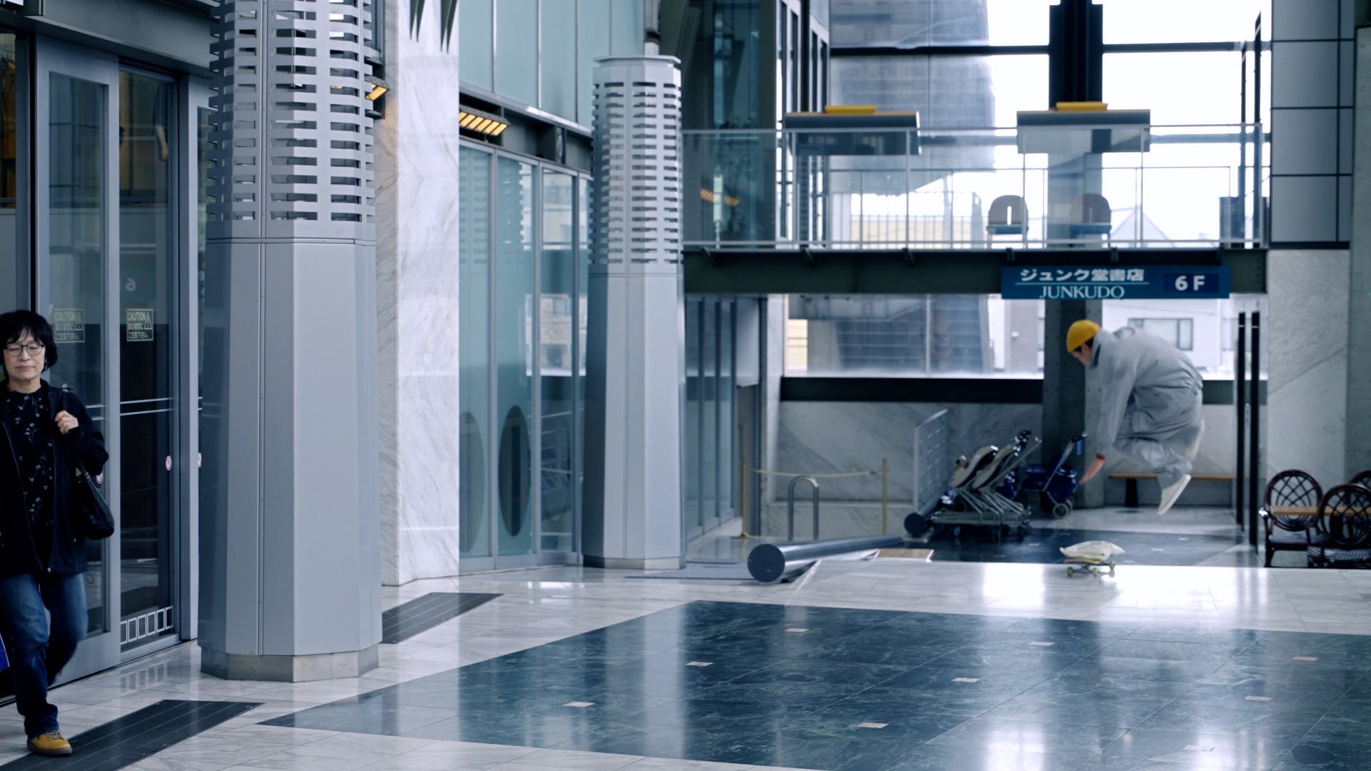 デパートから出てきたオシャレな男性(じろうさん)は、昔からの知り合いに遭遇。自身の近況報告から家族の話まで、久々の会話に花を咲かせましたが、最終的に少し気味の悪い話になってしまいました。別れ際には、「あ、今ちょうど米買って帰るところでさ、青天の霹靂。このまま持つのがいいのよ」と腕に抱える「青天の霹靂」をアピール。なぜか青天の霹靂をスケートボードに載せ、颯爽と(?)帰っていきました。