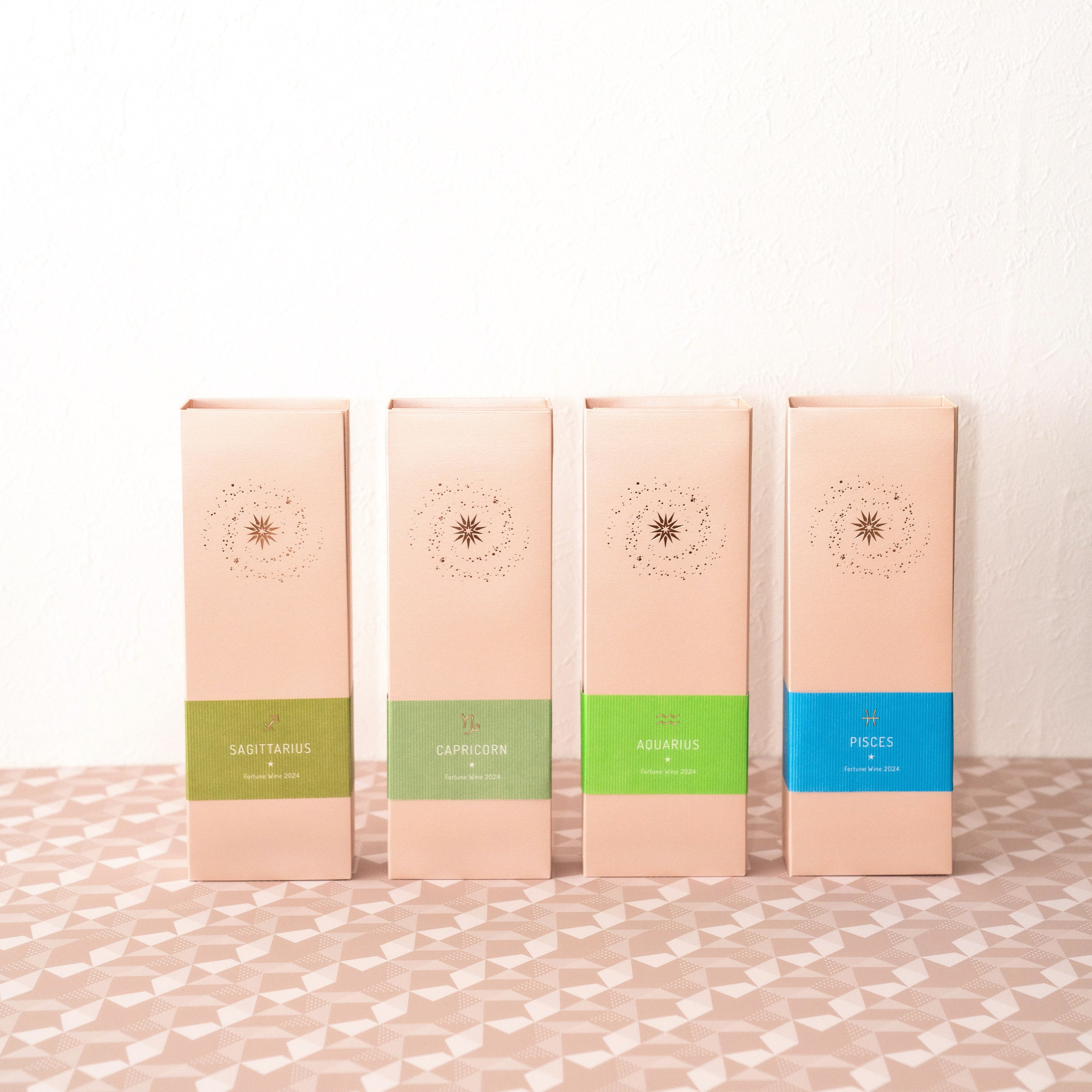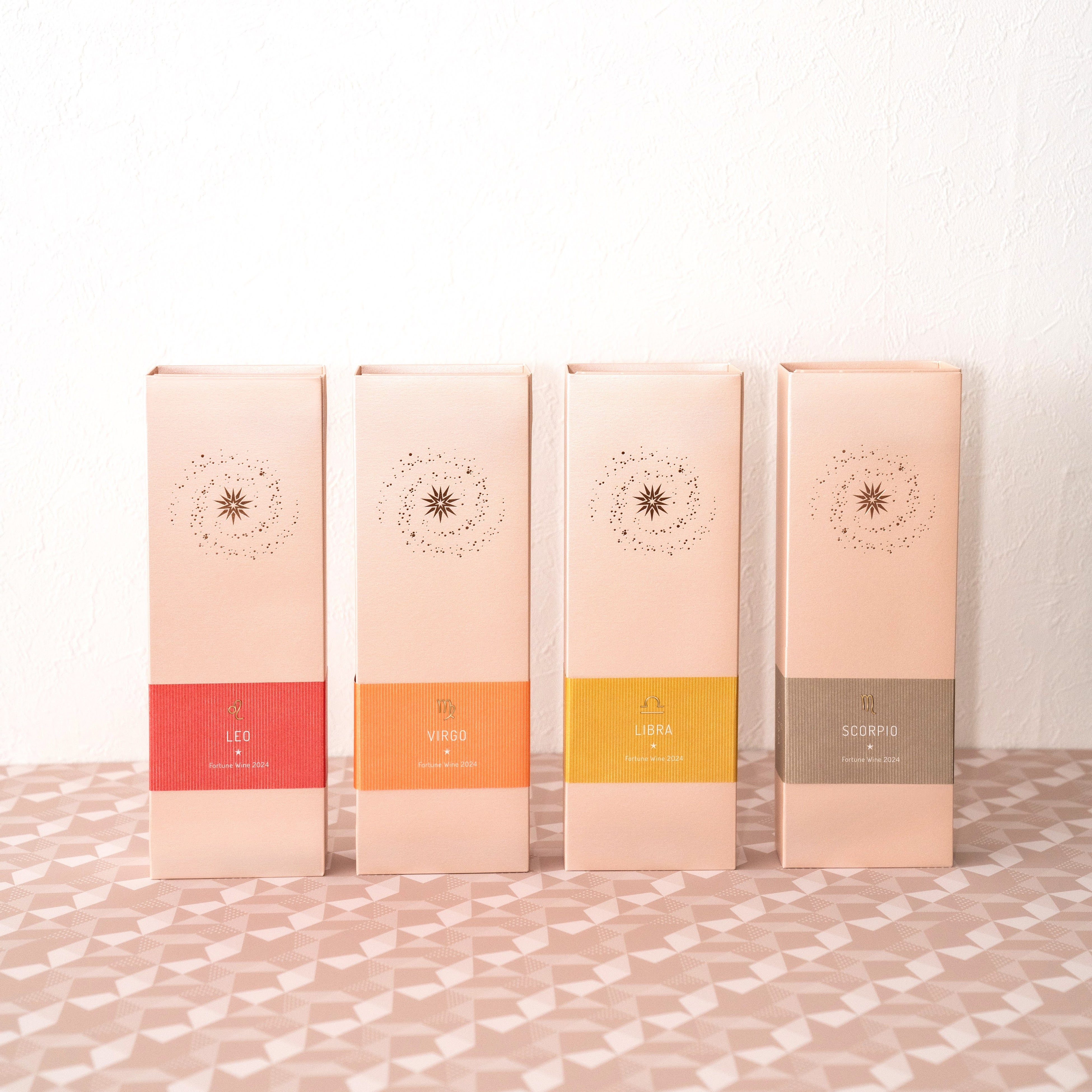 「Fortune Wine, 2024」は、各星座をイメージした1本100mlのワイン・占星術師による2024年の運勢メッセージカード・星座モチーフ付きのグラスチャームをセットにした新商品です。