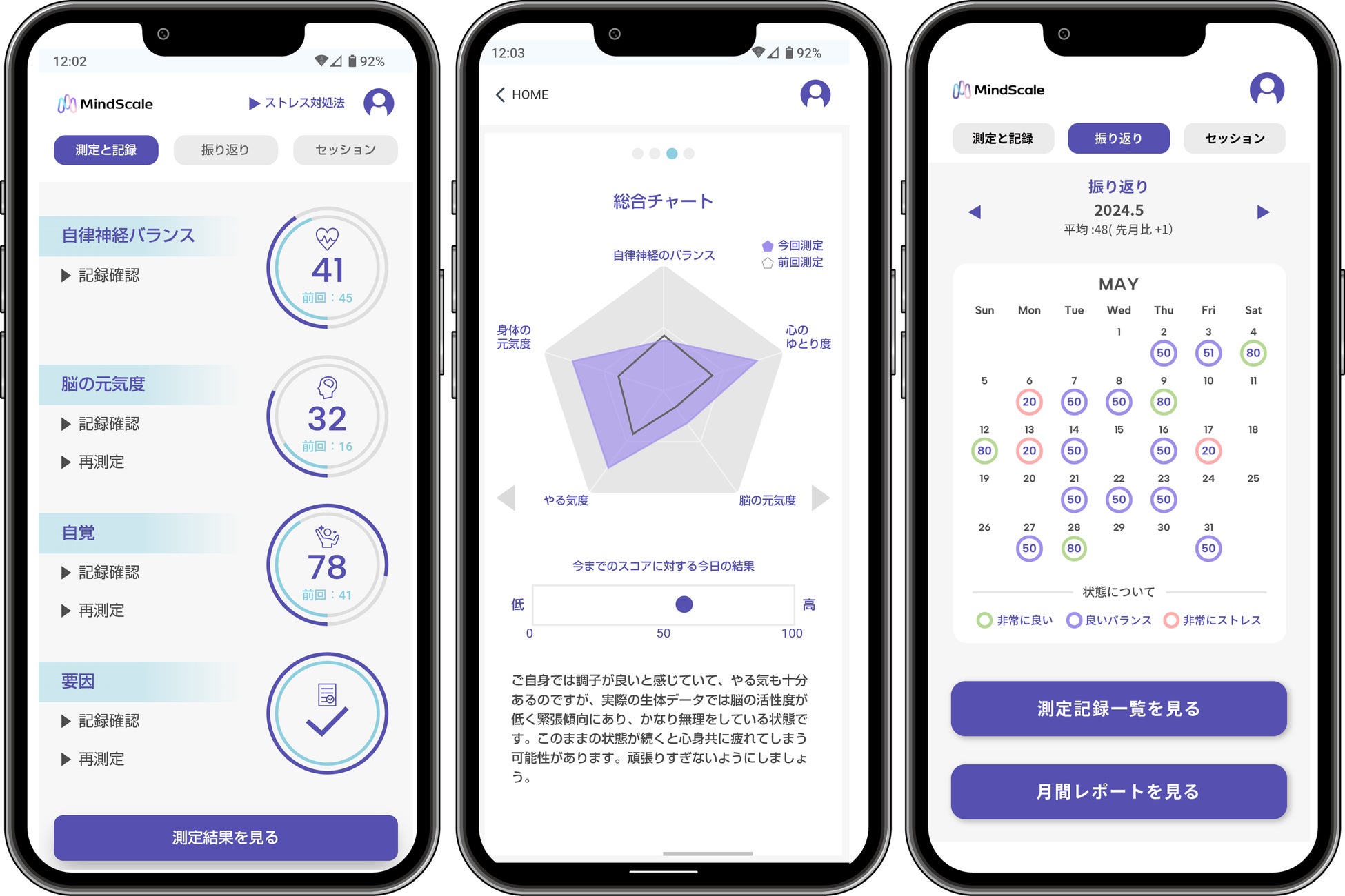 マインドスケールは、通常のストレスチェックを補完し、受検者の主観的判断だけではなく生体データを測定して客観的にストレス状態を分析します。さらに、約30万件の蓄積データを基にAI分析を通じて短時間で脳疲労や自律神経を含む総合メンタルバランスを可視化し、自身で把握していない自律神経のバランスや脳の疲労度を知ることができます。