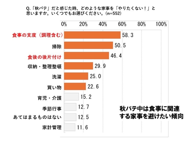 中でも、「食事の支度・調理」「食事の後片付け」「掃除」を避けたい人が半数を占めます。