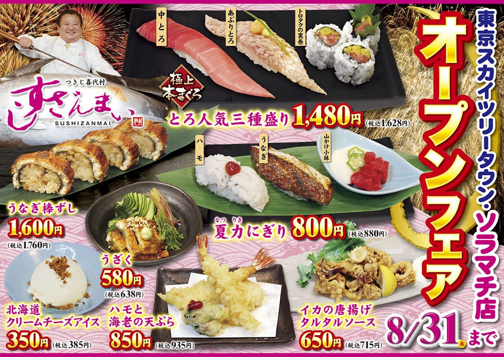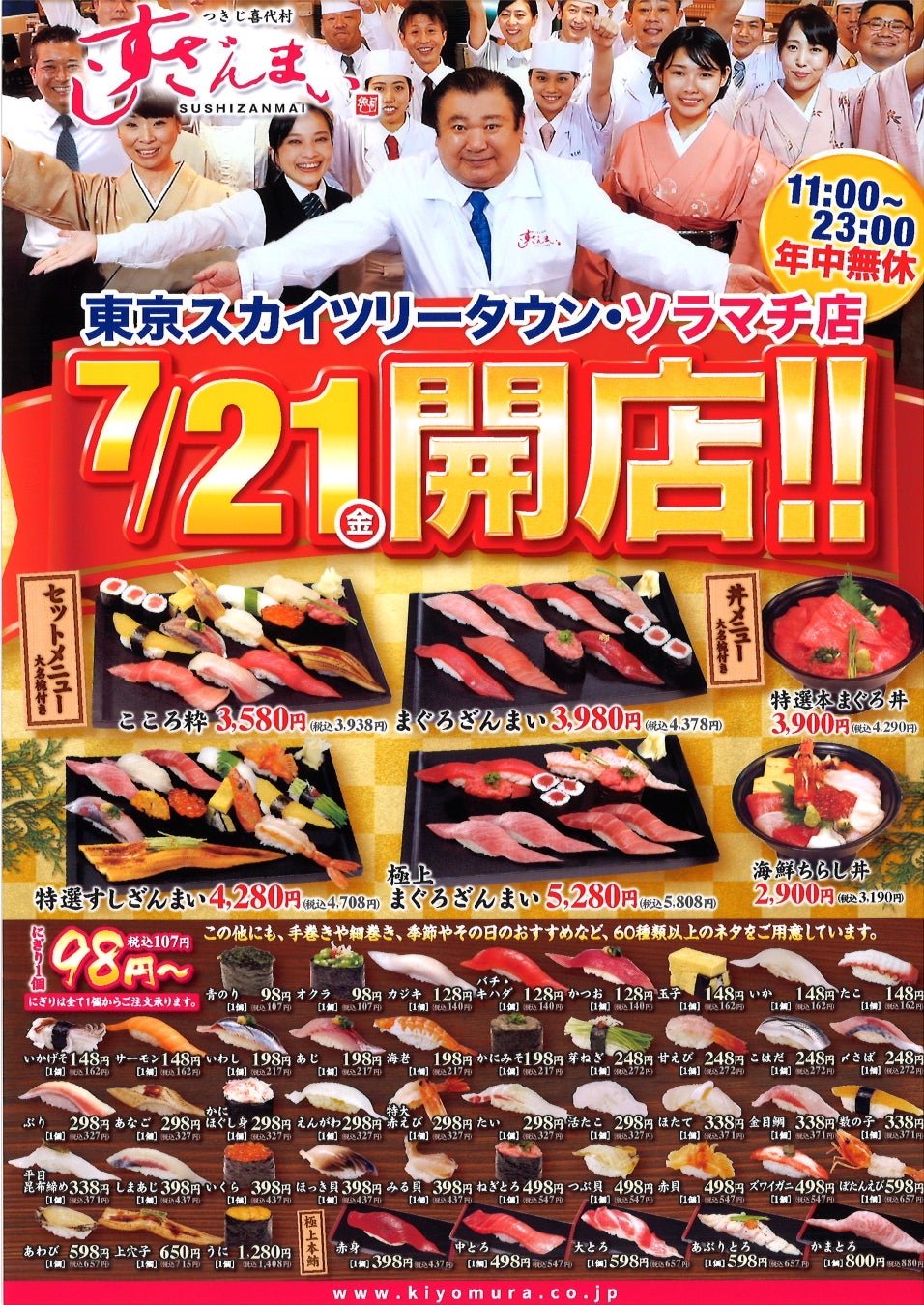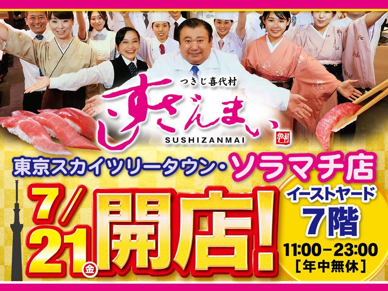 寿司チェーン店「つきじ喜代村すしざんまい」を運営する株式会社喜代村(本社:東京都中央区、以下「喜代村」)は、7月21日(金)、東京ソラマチ(R)に「すしざんまい」51店舗目となる「東京スカイツリータウン・ソラマチ店」(東京都中央区墨田区押上1-1-2 東京スカイツリータウン・ソラマチ イーストヤード7階、以下「すしざんまい東京ソラマチ店」)をオープンしました。