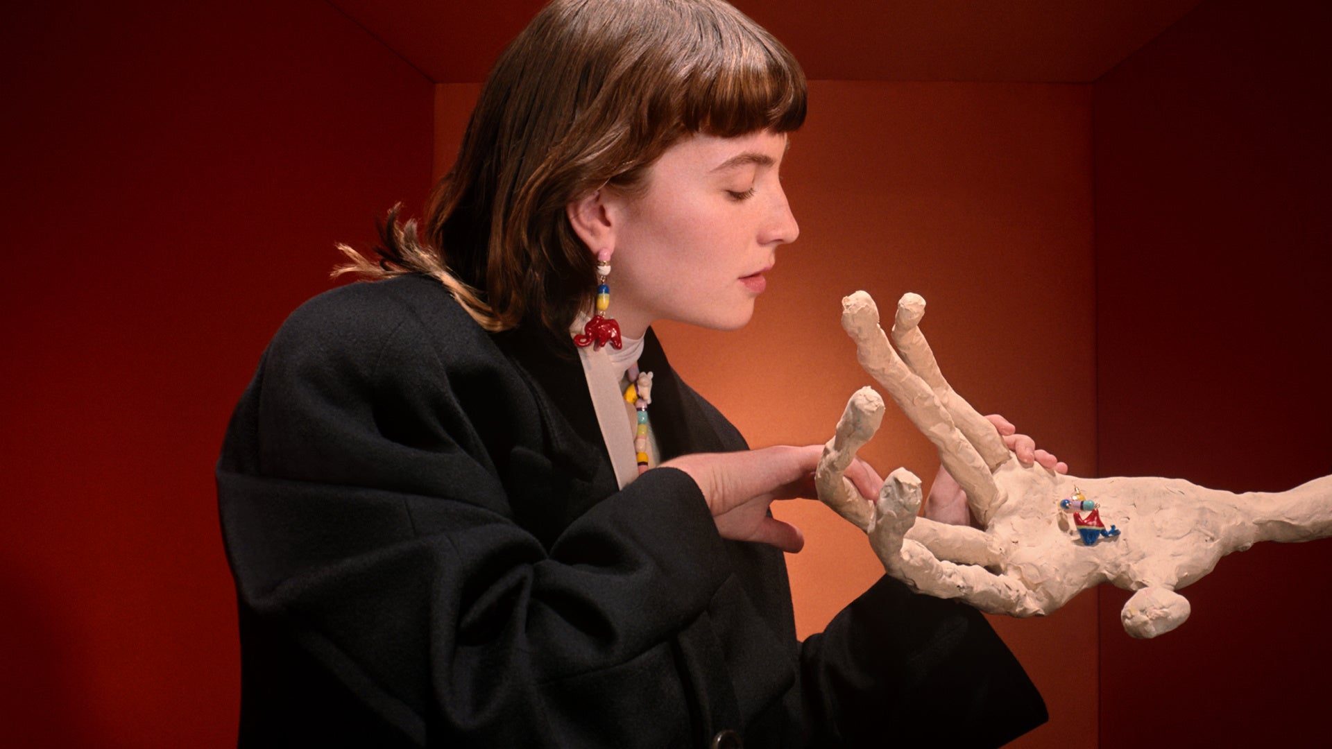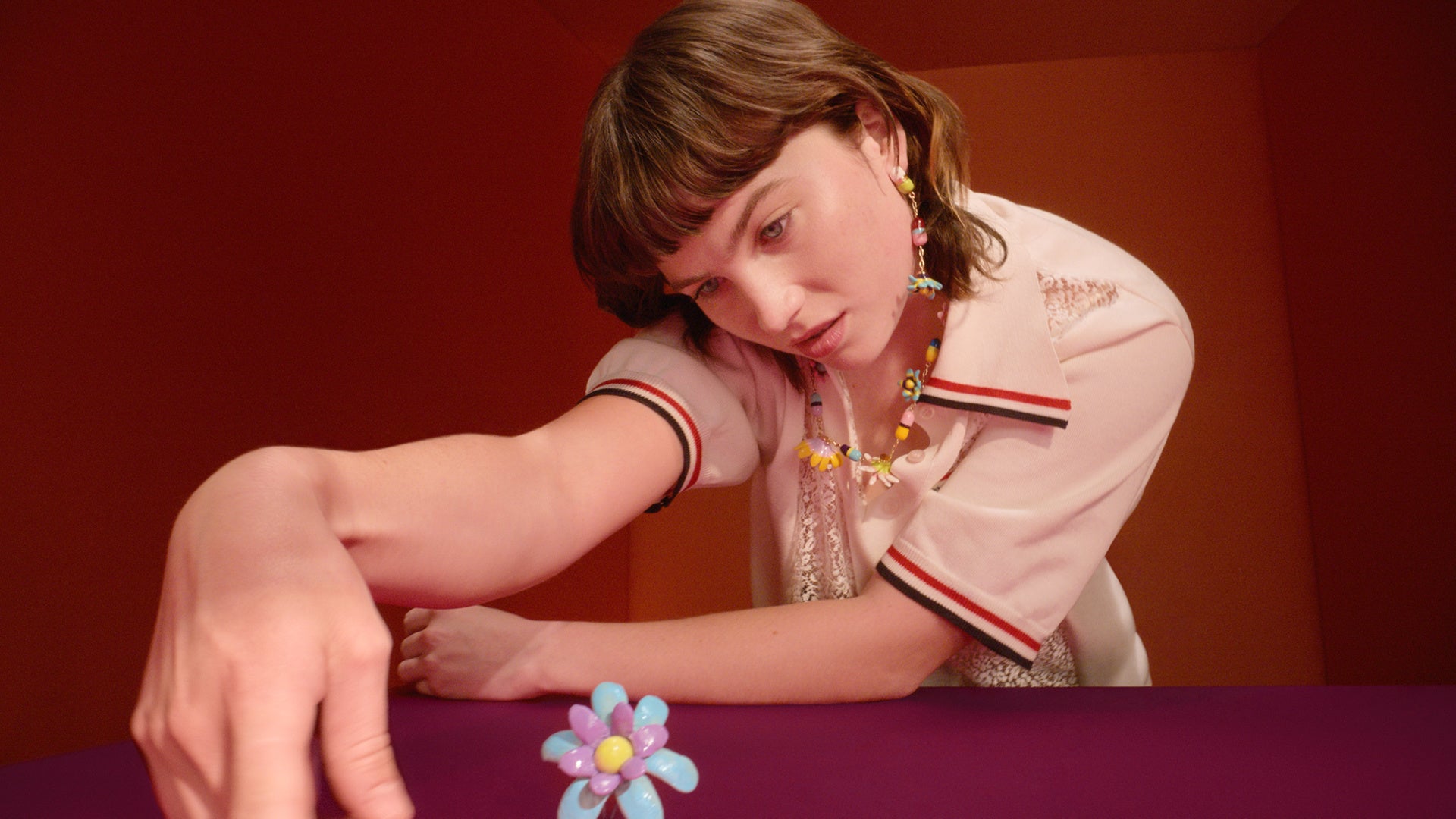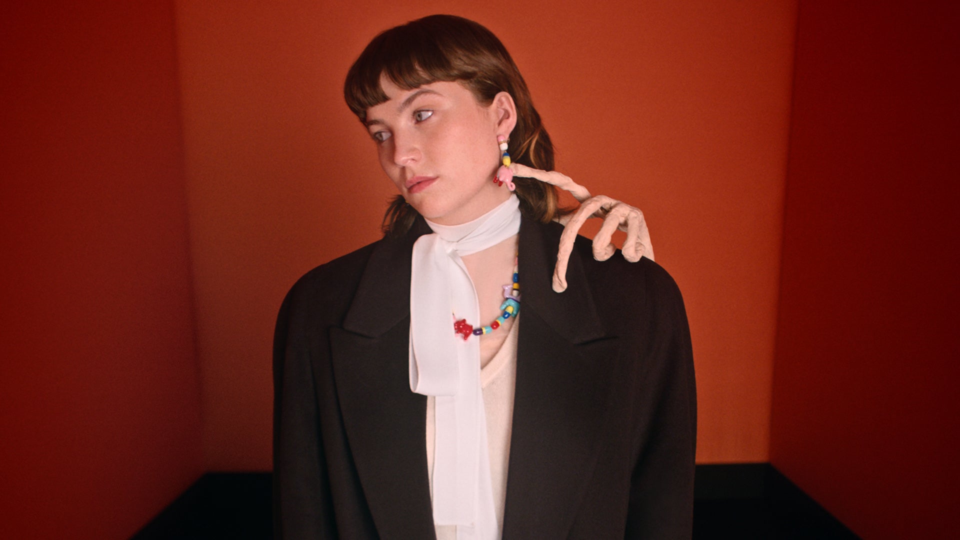 ユールベリとベリは、ジュエリーのデザインからパッケージの制作にとどまらず、本コレクションの広告キャンペーンのアートディレクションも担当。ジュリアン・マルティネス・ルクレールの撮影により、俳優のイザドラ・ビャッカルドッティル・バーニーがミュウミュウの世界へと誘われます。活躍する分野を超え、異質でありながらも情熱的かつ個性的なスタンスで結ばれたミュウミュウのミューズたちが築いてきた長い歴史に、イザドラが加わりました。極端な視点から撮影されたこのジュエリーは、ある瞬間には彼女の目を通して、次の瞬間には私たちの目を通して、そしてまた別の世界の生き物の目を通して表現されています。それはまたあの鳥と異様に大きな骸骨の手で、ジュエリーの親密さを反映する一方、意図的に混乱させるような方法でそのプロポーションを誇張しています。この不気味な侵入者は、キャンペーンの主役であるイザドラにジュエリーを与えているのでしょうか、それとも彼女から奪っているのでしょうか?それは誰にもわかりません。