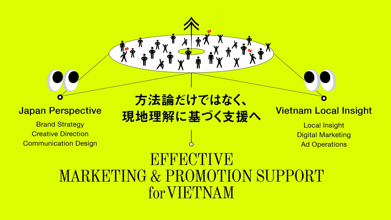 社会主義国であり、独自の商習慣や生活者とのタッチポイント、そして急速に変化する生活者心理を持つベトナムにおいて、現地の文脈や生活者理解に基づいて、"誰に、何を、どのように届けるか" を再設計することは極めて重要です。ベトナム国内でのマーケティング支援に求められるのは、単なる方法論の適用ではなく、深い現地理解と、刻々と変化していく市場環境・ソリューションへのスピード感のある実行と展開だと私たちは考えています。