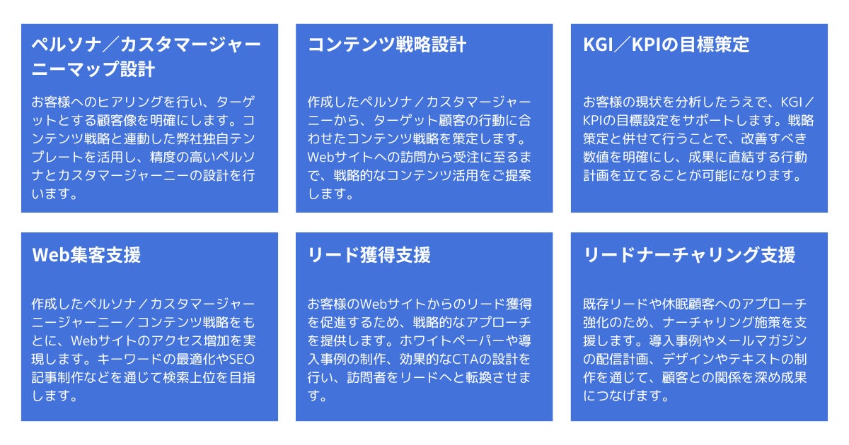 具体的には、ペルソナとカスタマージャーニーマップをベースにしたコンテンツ戦略設計やKGI/KPIの目標策定と、その目標を達成するための具体的な運用まで支援させていただきます。
