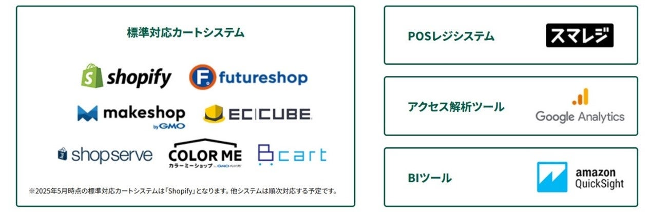 こうした理由により、サービスの継続的な成長のためデータ利活用の促進を目的として主にマーケティング系のサービスを拡充する流れとなりました。ECに関連するGA4やWebトラッキングデータ、ECカートシステムの各種データ、モールデータ、広告データ、店舗データなど、多様なデータを一元的に統合し活用できるクラウドプラットフォームへとリブランディングいたしました。本プラットフォームにより、ECデータの連携・分析・マーケティングを効率的に行える環境を実現しています。
