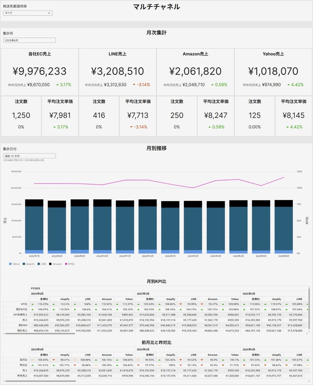 GA4データ、受注データ、商品データ、会員データ、在庫データ、モール(OMS)データ、広告データを統合し、一目で状況を把握できるダッシュボードをサービス開発いたしました。エンタープライズ企業を中心に、ECサイトの分析や施策立案・実行を継続的に支援し、売上拡大を実現してきた知見とノウハウを反映した、約50の分析レポートテンプレート画面を簡単操作で利用・共有することが可能です。