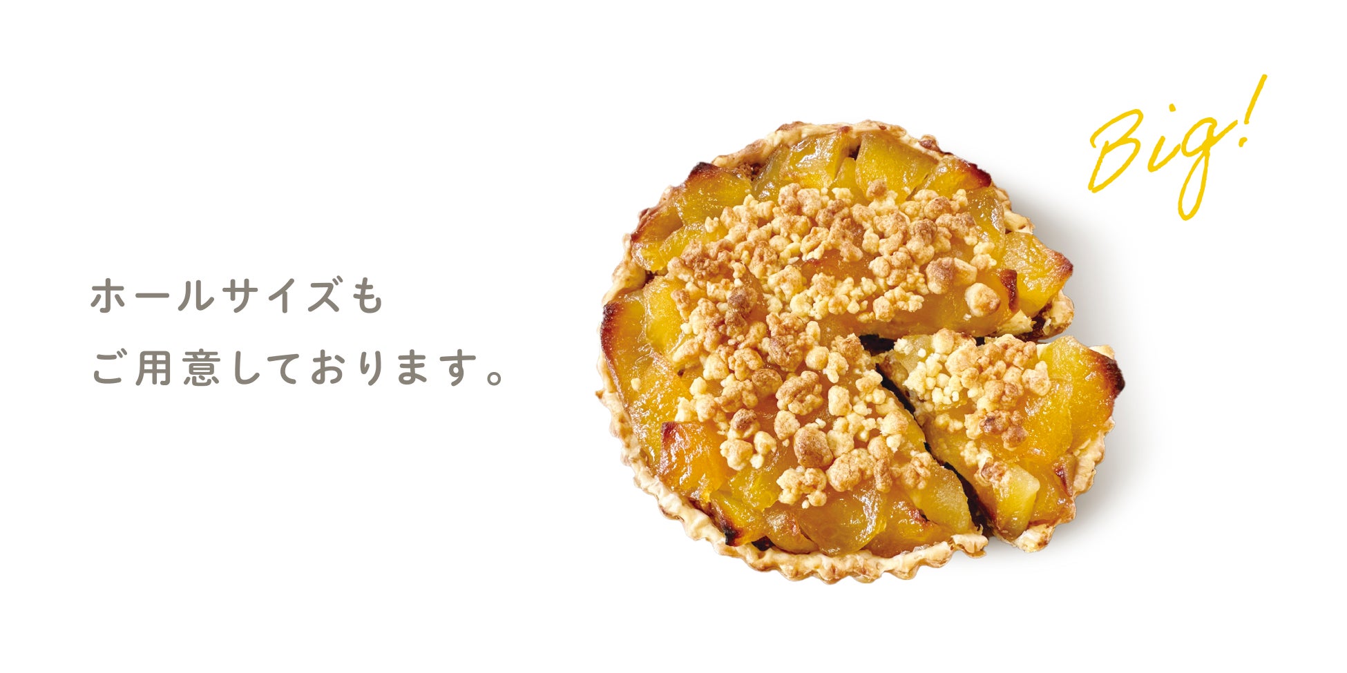 サマーアップルパイは、ホールサイズもご用意しております。ホールは、ミニ8個分のりんごを使用。表面にはあら、りんご。人気のクランブル生地をトッピングして更なるアクセントを加えています。