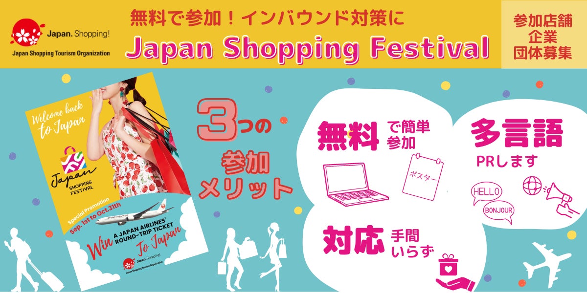 一般社団法人ジャパンショッピングツーリズム協会(本部:東京都千代田区、会長:田川博己 以下、JSTO)は、この度、観光庁「観光再始動事業」に選出された、訪日外国人客(以下、訪日ゲスト)向けの日本最大級のショッピングイベント“Japan Shopping Festival(JSF)”において、2024 年 4 月 30 日まで参加店・企業・自治体を募集しています。7月14日の申込開始から僅か1週間で、築地場外市場やかっぱ橋道具街の一括免税サービスに参加している店舗、人気アパレルブランドなどインバウンドに取り組む100店舗以上からの参加申込がありました。今回はJapan Shopping Festivalの2つのスペシャル企画をご案内申し上げます。この機会にぜひ、ご参加ください。※「かっぱ橋道具街」は、東京合羽橋商店街振興組合の地域団体商標です。