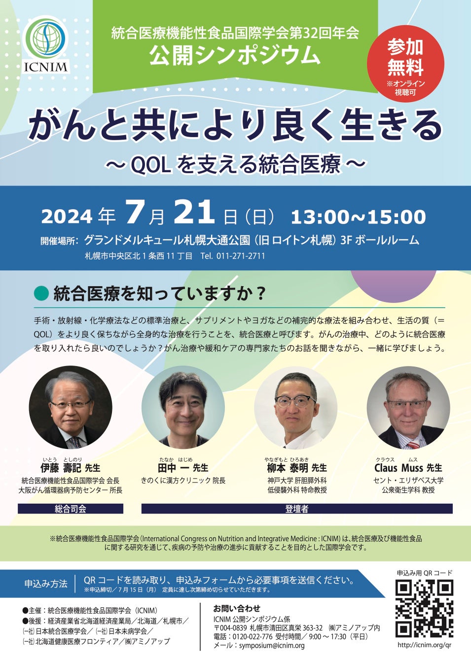 公開シンポジウムは、「統合医療がもたらす新たな医療の可能性」をテーマとするICNIM年会のシンポジウムを一般公開することで、市民の皆様の学びの場として提供されるものです。本年は「がんと共により良く生きる」と題して、がん患者の生活の質(QOL:Quality of Life)を支えるために、統合医療を治療にどう取り入れるか、専門医がそれぞれの分野からわかりやすく解説します。