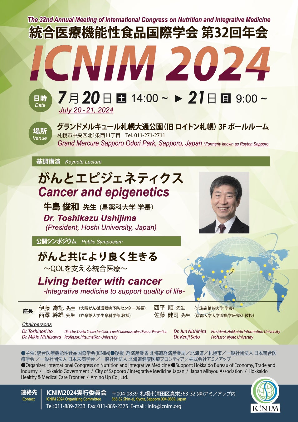 株式会社アミノアップ(北海道札幌市、代表取締役会長 小砂憲一、代表取締役社長 北舘健太郎)は7月20日(土)、21日(日)に、グランドメルキュール札幌大通公園で開催される統合医療(*)機能性食品国際学会(ICNIM:International Congress on Nutrition and Integrative Medicine)第32回年会および同年会の一部を一般市民にも公開する、公開シンポジウム「がんと共により良く生きる」を後援いたします。