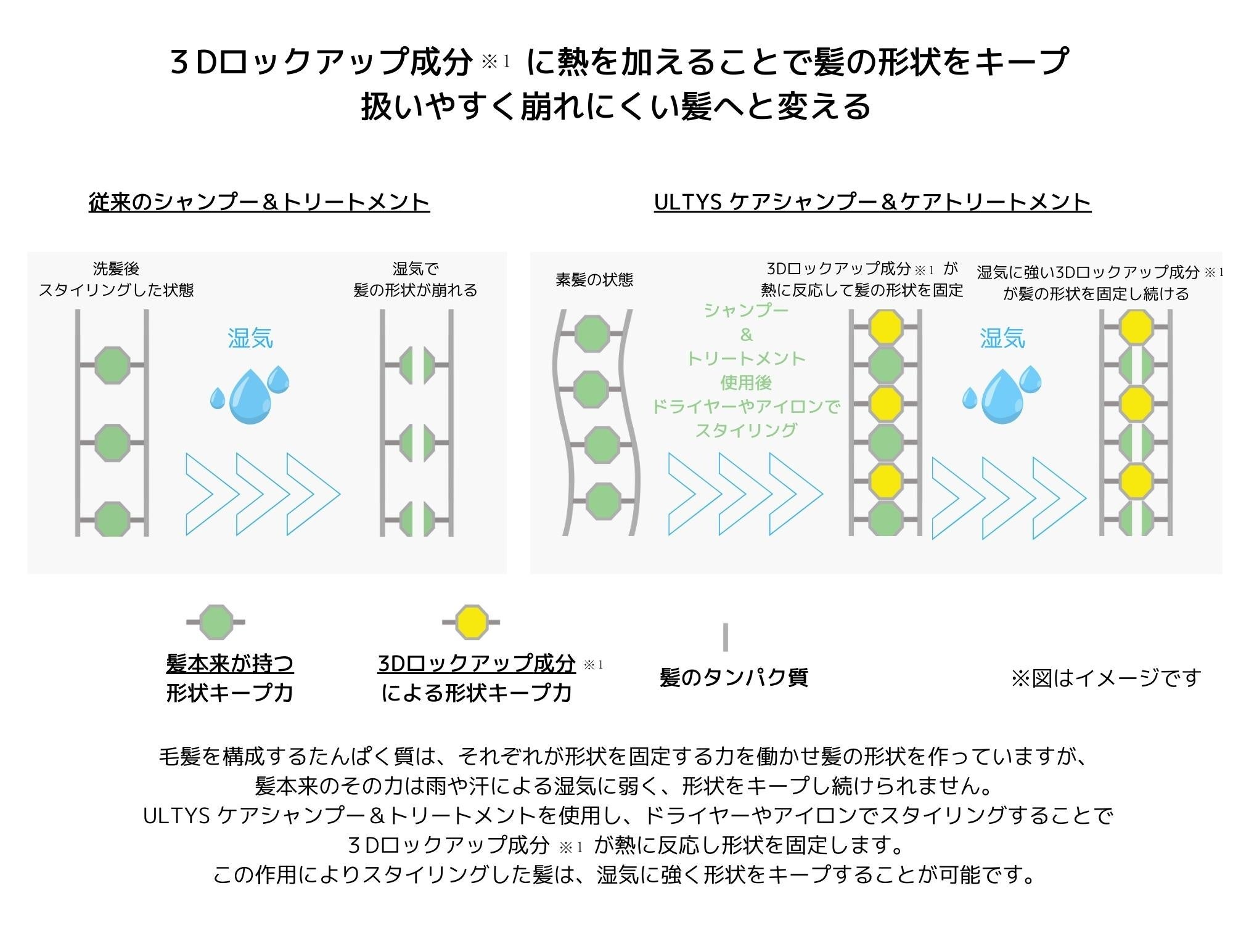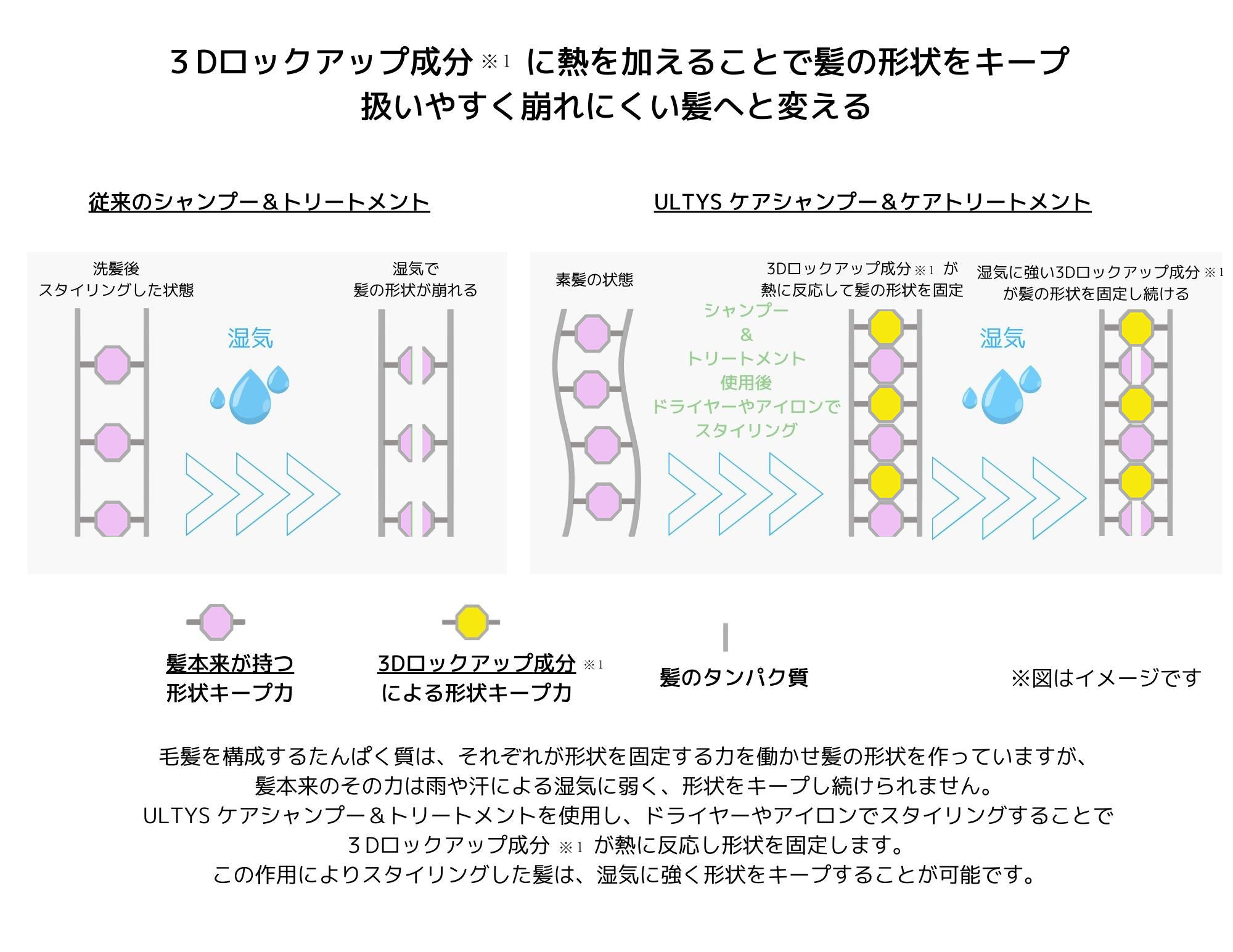 新規成分を独⾃処⽅(3Dロックアップ)で⽑髪の形状をキープ ※ヘアサロンで、検証に検証を重ね商品化