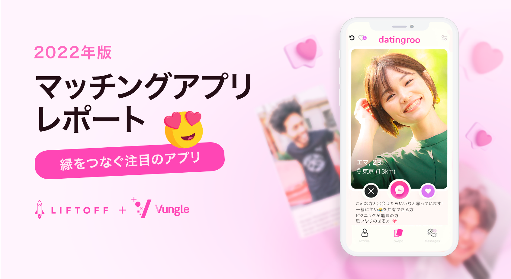 モバイルアプリマーケティングとリターゲティングプラットフォームを提供するLiftoff Mobile 株式会社(本社:東京都渋谷区、代表取締役:Mark Ellis、シニアカントリーマネージャー:天野 耕太)は、2月14日のバレンタインデーを前に、デーマッチングアプリの分析をした「2022年版マッチングレポート」を発表しました。本レポートでは、マッチングアプリのユーザー獲得、プラットフォーム、月、国別の動向をまとめています。