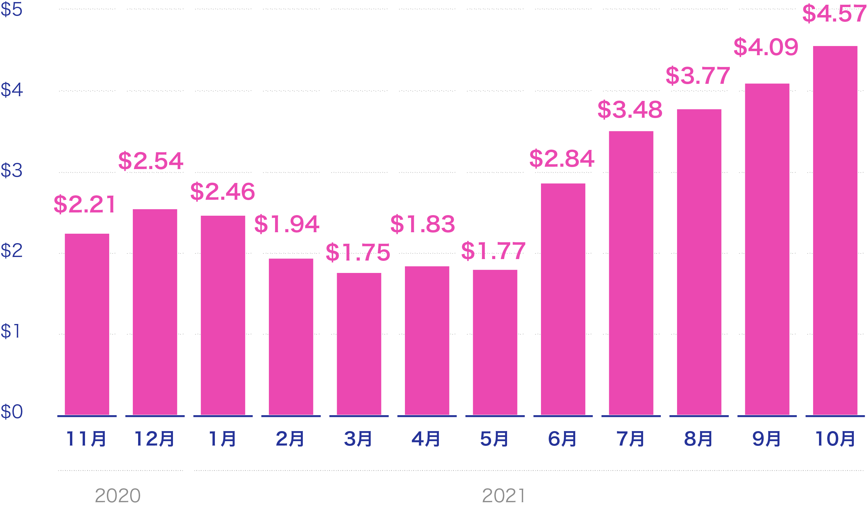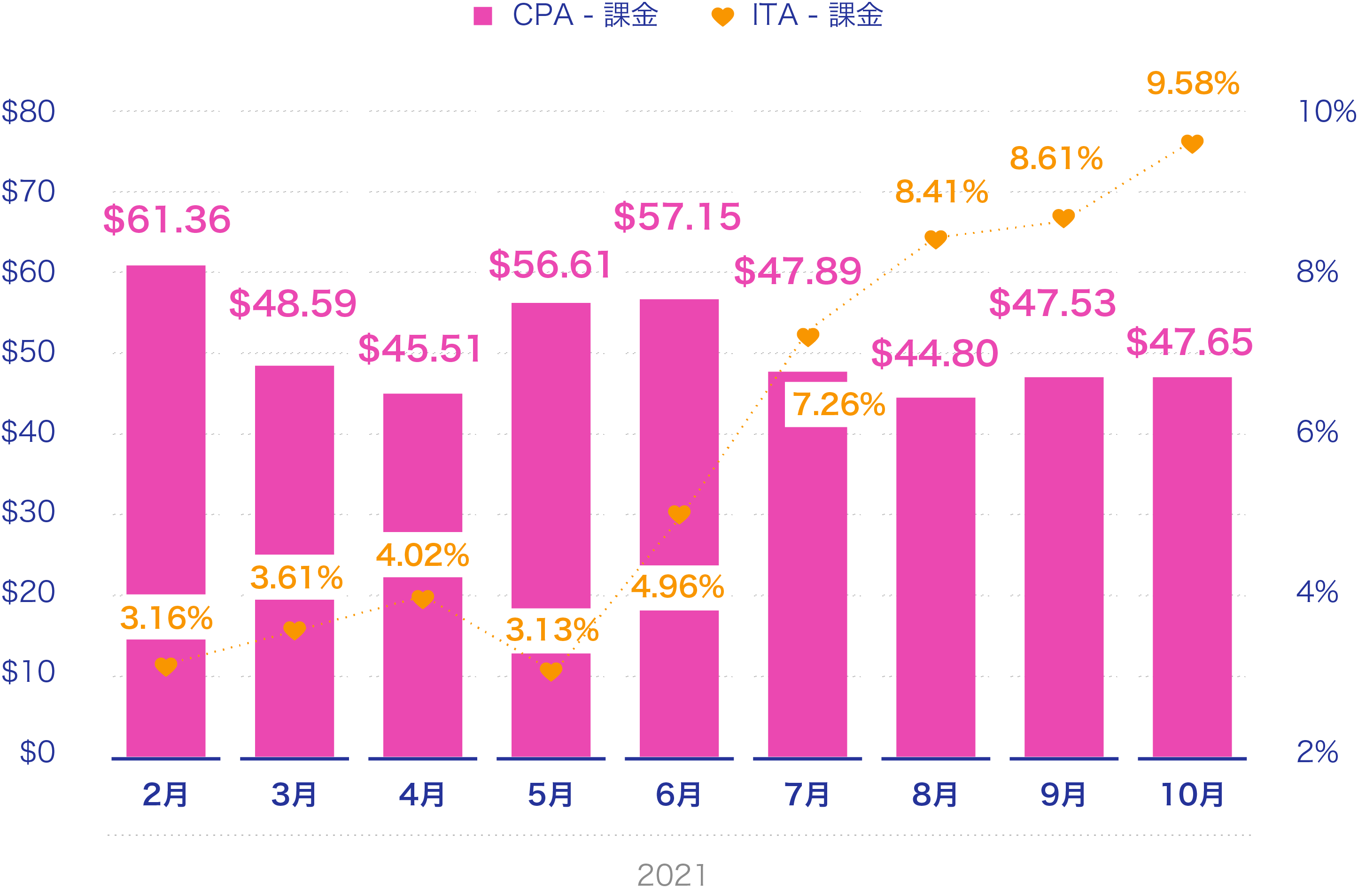 2021年5月に課金率は年間最低の3.13%まで落ち込んでいるものの、世界的なホリデーシーズンでもある夏に差し掛かり、また、ワクチン接種が進んだことも起因し、マッチングアプリでの出会いを求めたユーザーが増えた結果、2021年10月には9.58%まで上昇しました。